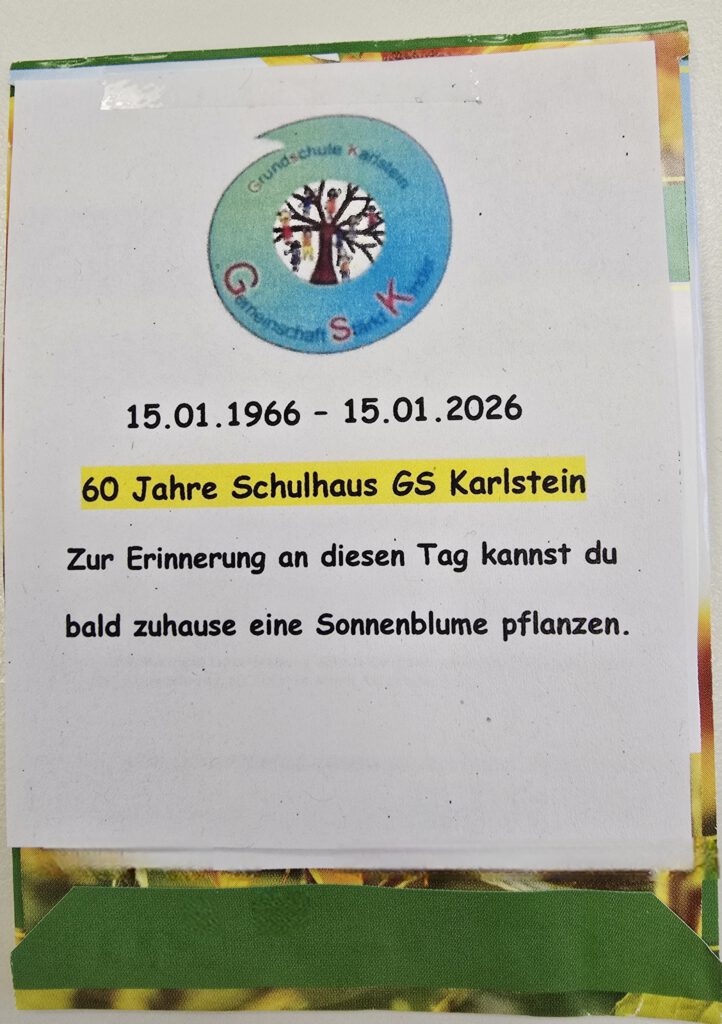 Heute kamen alle Schülerinnen und Schüler mit ihren Lehrerinnen und Lehrern in der Aula der Schule zusammen, um zum ersten Mal das Karlsteiner Schullied „Hand in Hand“ gemeinsam zu singen. Zur Erinnerung an diesen besonderen Tag erhielten alle Schülerinnen und Schüler ein Tütchen mit Sonnenblumenkernen, damit sie zuhause im Frühling eine Sonnenblume pflanzen können.