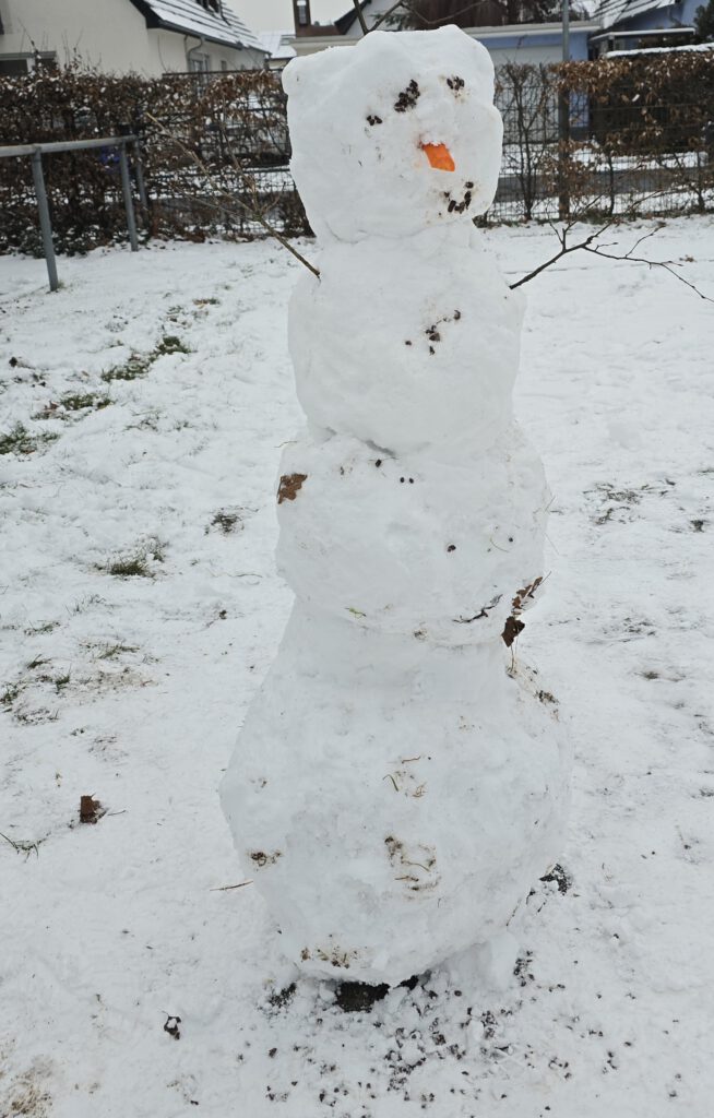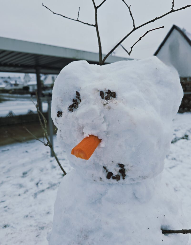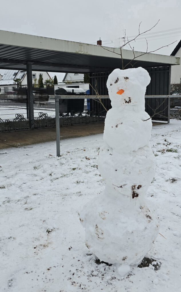 Wir sind zurück – nach den Weihnachtsferien! Die Kinder freuen sich, dass es schneit und bauen in der 15minütigen Pause schnell einen großen Schneemann. Mal sehen. wie lange er zu Besuch im Pausenhof bleibt … !